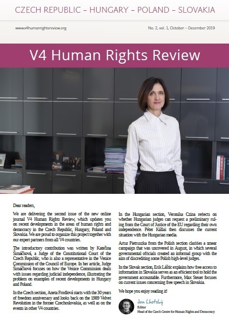 We are delivering the second issue of the new online journal V4 Human Rights Review, which updates you on recent developments in the areas of human rights and democracy in the Czech Republic, Hungary, Poland and Slovakia. We are proud to organize this project together with our expert partners from all V4 countries.